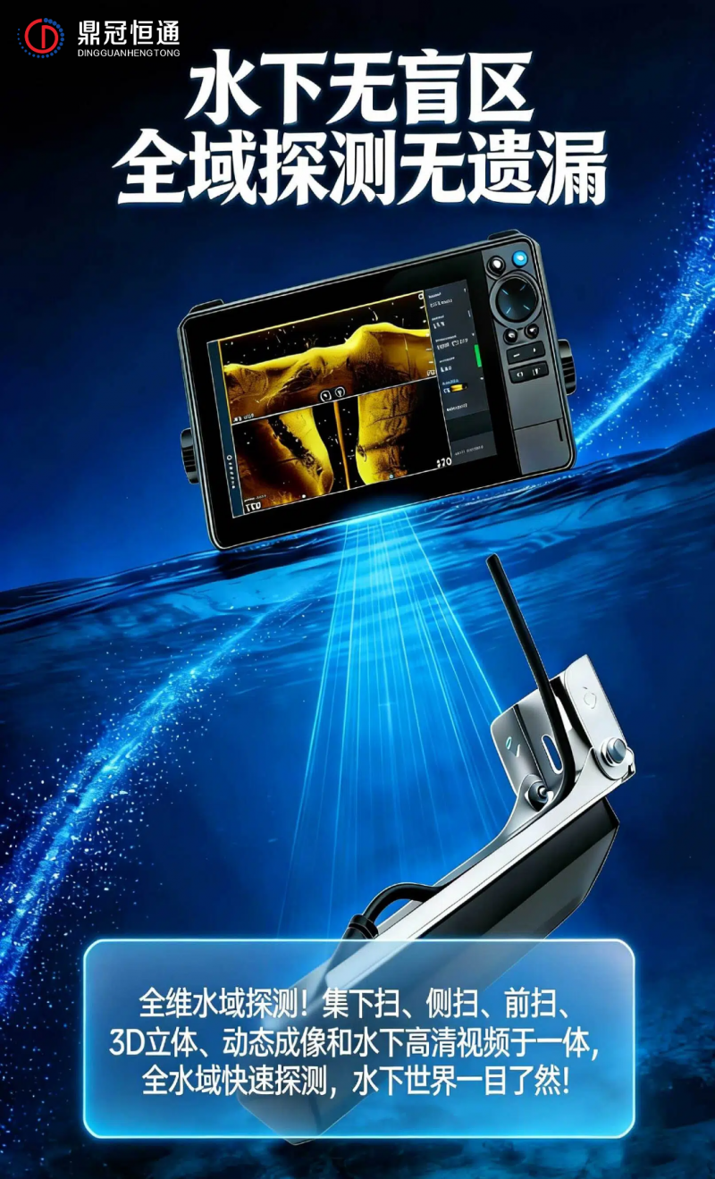 这款水下声呐探测仪全维水域探测!集下扫、侧扫、前扫、3D立体、动态成像和水下高清视频于一体,全水域快速探测,水下世界一目了然!