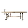 不锈钢板制作,明亮光洁,容易清洗,经久耐用。配备洗手池、不锈钢水龙头和喷淋冲水头。地脚有四个轮子,解剖床可随意移动,轮子有刹车装置,使用时可固定位置。尺寸:长 2440mm 、宽 720mm 、高 735mm 。